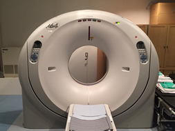 身体の周囲の各方向からX線を扇状に照射し、透過するX線の強さの分布を基に身体の断層像をコンピュータで計算して求めて診断に用いる装置です。本学には3台の各種CT装置があります。 -