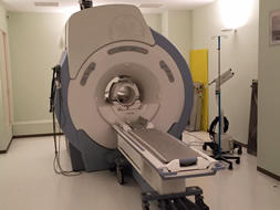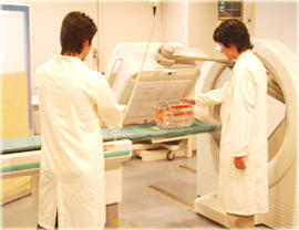 磁場中ではある特定の周波数で身体の中から電磁波を発生させることが出来ます。その電磁波を捉えて身体の断層像を映し出すのがMRI装置です。本学には超伝導磁石を用いた装置と永久磁石を用いた装置の2種類のMRI装置があります -