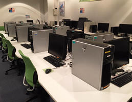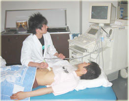 体内に超音波を送信し、体内から反射してくる超音波を捉えてリアルタイムで断層像を映し出して診断に用いる装置です。本学には普及タイプから高級タイプまで10数台の装置があります。 -