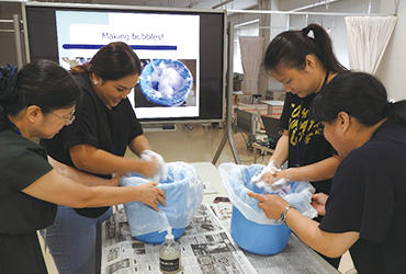 授業期間中の研修だったので、各授業担当教員に協力いただき、多くの既存のゼミや授業に参加することができました。看護学科の「老年看護」ゼミでは体験グッズを身に着けて高齢者を疑似体験し、理学療法学科では「バーチャル解剖学実習」へ参加し、「関連職種連携ワーク」の英語チームにも参加するなど、本学学生との交流を深めました。また、4月に開設した留学生別科の先生方のご協力で、日本語のレッスンと日本文化体験をしました。