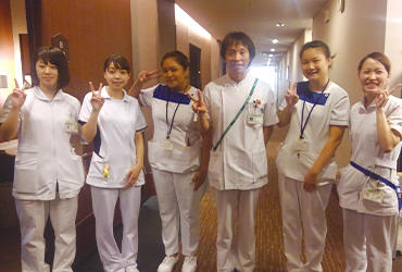 国際医療福祉大学病院前で病院スタッフと -