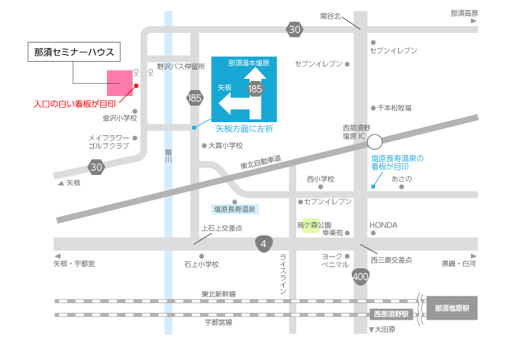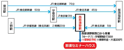 JR「西那須野駅」西口から「ゆータク」(宇都野線)で約30分、「野沢」バス停で下車・徒歩5分「ゆータク」を利用する際は、必ず事前に予約が必要です。くわしくは那須塩原市のホームページをご確認ください。