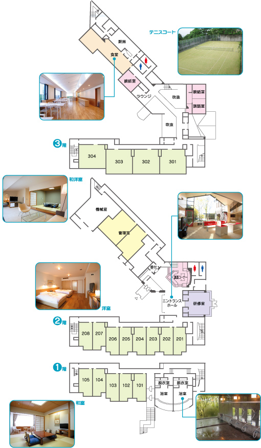 ■大浴場(温泉) ■研修室 収容人員24名 ■談話コーナー ■食堂 ■自販機コーナー ■テニスコート ■駐車場 19台