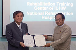 本学は2004年以来、授業料から滞在中の生活費などを負担するIUHW奨学金制度により計17名のミャンマー留学生を受け入れ、帰国した卒業生の多くが母国の病院で勤務したり、大学教員として指導したりするなど交流を深めてきました。昨年2月、ミャンマーの医療水準向上とリハビリテーション分野の人材育成に協力する覚書を同国保健省と締結、その内容に基づいて昨年8月には国立リハビリテーション病院内に「IUHWリハビリテーション研修センター」を開設しました。開設記念として本学の教員4名とJICAシニアボランティア1名(本学特任教授)が、ヤンゴンの医療福祉関係者を対象に研修を実施しています。
