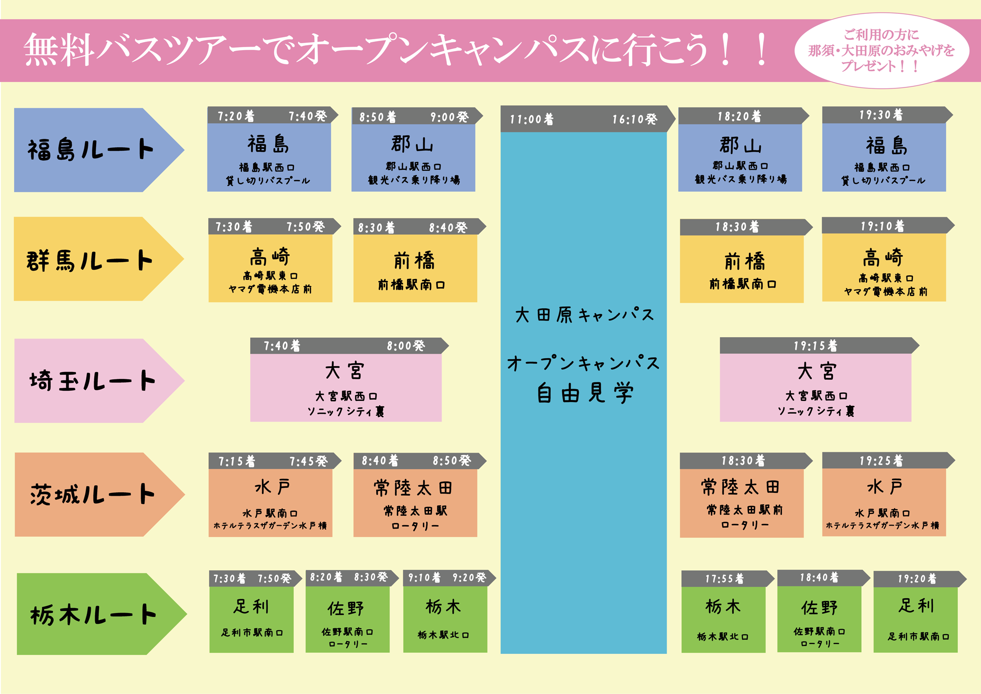 ※運行スケジュールは変更になることがあります。 - 各都市と大学を直通で結ぶ無料バス(要予約)を運行します。