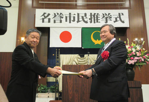 同市の名誉市民は人間国宝の竹工芸家、藤沼昇氏以来5年ぶり10人目となります。