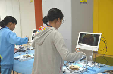 中学生コースの「シミュレーション体験! 救急患者の体の中は?~発見から治療まで~」では、心肺蘇生、超音波検査、内視鏡外科手術トレーニング、糸結び・結紮体験をし、救急場面から診断・治療の連続性を考えながら学修しました。