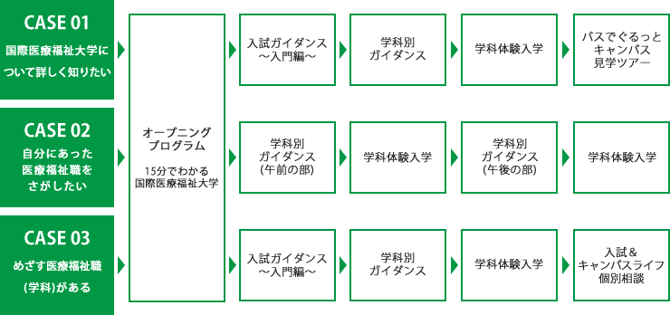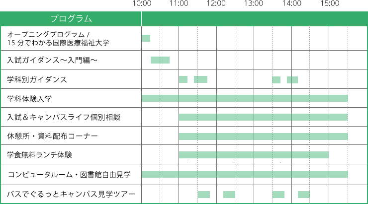![]() オープニングプログラム/15分でわかる国際医療福祉大学 ●10:00~10:15 国際医療福祉大学の様々な情報を分かりやすくご説明します。また、大田原キャンパスの特長や敷地内の施設、オープンキャンパスの見どころもご紹介します。 |