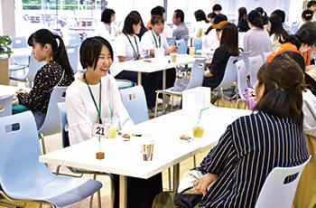 同じく特別企画「Cafe de IUHW」では、先輩たちとお茶をしながら楽しくおしゃべり。志望する学科や同じ出身県の先輩たちに、入試のこと、一人暮らしのこと、キャンパスライフのこと...いろいろなポイントについて熱心に聞いている姿が見られました。