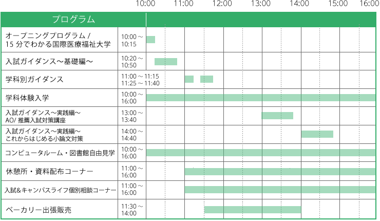 ![]() オープニングプログラム/15分でわかる国際医療福祉大学 ●10:00~10:15 国際医療福祉大学の様々な情報を分かりやすくご説明します。また、大田原キャンパスの特長や敷地内の施設、オープンキャンパスの見どころもご紹介します。 |