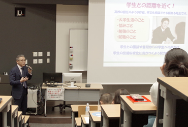 最初に百瀬泰行・薬学部長が「大田原キャンパス薬学部の特長」と題して講演。本学が10学部24学科をそろえ日本初の医療福祉の総合大学であること、5附属病院ほか多くの医療福祉施設を持つことの強みを踏まえ、「臨床に強い薬剤師の育成とチーム医療・チームケアを実践する力を養成している」ことを紹介しました。また、大きな特長としてチューター制による勉強や生活のサポート、キャンパス内にクリニックを整備しているなど強力な健康のサポート、就職率100%を誇る就職サポート、充実した学費サポートなどについて詳しく説明しました。