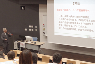 続いて、白石昌彦・薬学科長が、全国トップレベルの高い国家試験合格率を維持してきた学修内容について1年次から卒業までの6年間について分かりやすく説明しました。とくに国試対策については、出題範囲や試験問題を例に、どのような対策をとっているのかを具体的に述べました。