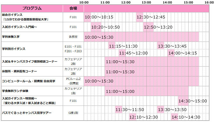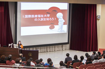![]() 総合ガイダンス 15分でわかる国際医療福祉大学 時間:①10:00~10:15 ②12:30~12:45 国際医療福祉大学の様々な情報を分かりやすくご説明します。また、大田原キャンパスの特長や敷地内の施設、オープンキャンパスの見どころもご紹介します。 |