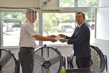 寄贈式では栃木工業高校・近藤正校長へ本学の大石剛史ボランティアセンター長からベルマークを活用して購入したMIZUNO大型扇風機3台が送られました。近藤校長からは、これらの扇風機を体育館で暑さ対策として有効に使っていきますとお話しされていました。