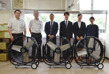 寄贈した大型扇風機と一緒に記念写真