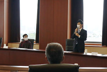 新型コロナウイルス感染症拡大のため、本学からは今年度奨学生になった8人のうち代表2人と大友邦学長ら、あいおいニッセイ同和損保からは金杉恭三社長ら少人数が出席し、例年より規模を縮小して開催しました。