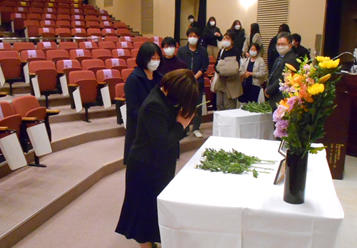 今年度はコロナウイルスの影響で、例年のように教職員と学生が一堂に会して開催するのを避けて、16時半から1時間半の時間帯に自由に会場に出向き、参拝しました。