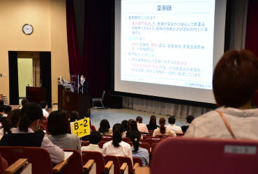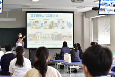 この日は、最初に新井田孝裕副学長より本学の概要について説明があり、続いて「医療福祉入門講座」と題して、医療福祉・マネジメント学科山本康弘学科長が本学で資格を取得できる医療福祉の仕事について紹介しました。
