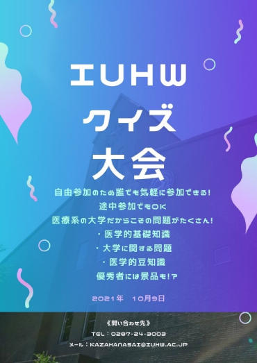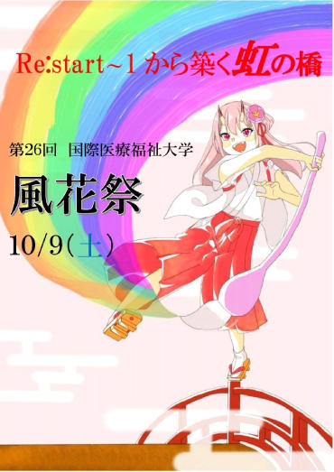 ■テーマ 「Re:start~1から築く虹の橋~」 ■開催日時 10月9日(土)13:00~17:00(予定) ■参加対象 大田原キャンパス学生、学生のご家族、教職員 ■催し物 有志団体のステージ発表 クイズ大会(当日オンラインでの参加型) 講演、等 ※配信サイトのURLや詳細なプログラムは、後日学生を通じてご連絡いたします。