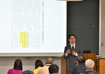 総合講義の第5回は、日本経済新聞社の大林尚編集委員に「どうなるアフターコロナの医療と社会保障~真の医療再生は検証から~」をテーマにご講義いただき、学生・教職員・市民合わせて約130名が聴講しました。