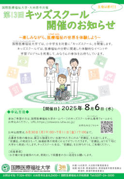 国際医療福祉大学では、小中学生を対象に「キッズスクール」を開催します。