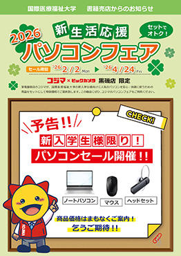 2026年新入生の学生生活をサポートするためにノートパソコンを特別価格にて販売いたします。申込開始日に商品の詳細および申込方法についてお知らせいたしますので、今しばらくお待ちください。なお、既にノートパソコン等をお持ちの場合は新規購入いただく必要はございませんが、入学後数年間の学生生活で活用するために、予め十分な性能を有することをご確認ください。推奨スペック等については入学許可証に同封の「学修に活用するPC等準備のお願い」をご覧ください。