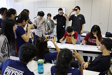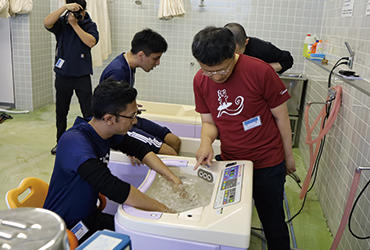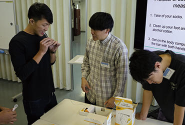 21日の午前中は、学科の見学ツアーと測定機器の体験を行ないました。パラフィン療法、水治療法、呼吸機能や体組成の測定を在学生と体験しました。学生は、簡単な英語やジェスチャーでコミュニケーションをとっていました。お昼は、授業で仲良くなった学生と一緒にランチパーティーを行ないました。シンガポールの話題などで盛り上がっていました。午後は、谷教授の「運動学習」の授業と演習を学部生と行ないました。