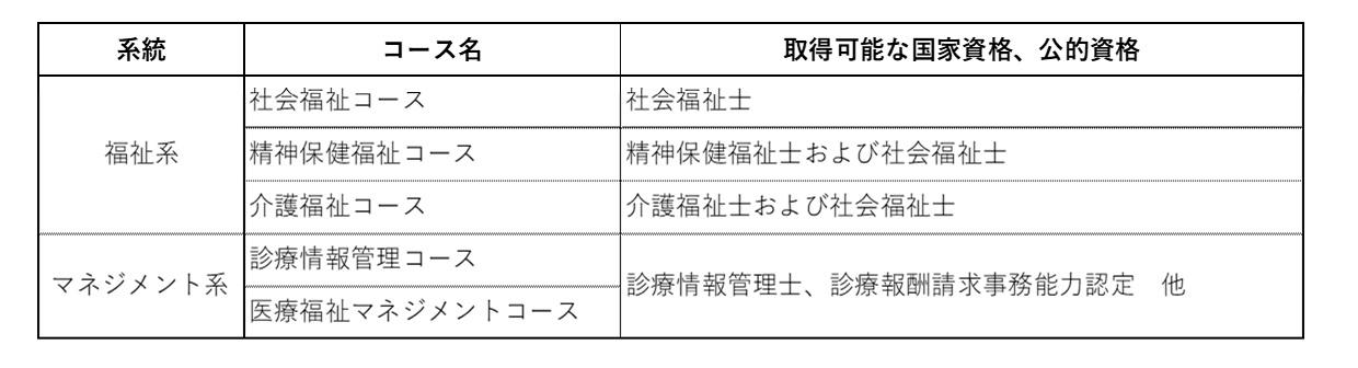 ※その他の4つのコース(「社会福祉コース」、「精神保健福祉コース」、「診療情報管理コース」、「医療福祉マネジメントコース」)については、履修希望を調査の上、2年次進級時にコースを決定します。