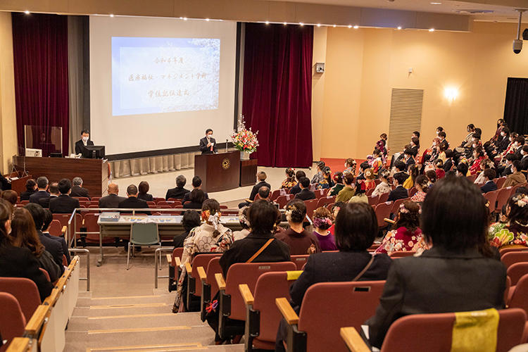 3月10日(金)、令和4年度 医療福祉・マネジメント学科の学位記伝達式が執り行われました。 今年度から感染防止策を徹底したうえで保護者1名の参加が可能となり、146名の卒業生たちの新たな門出を祝福しました。 新たなスタートを迎える卒業生の皆さん、おめでとうございます!