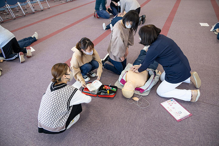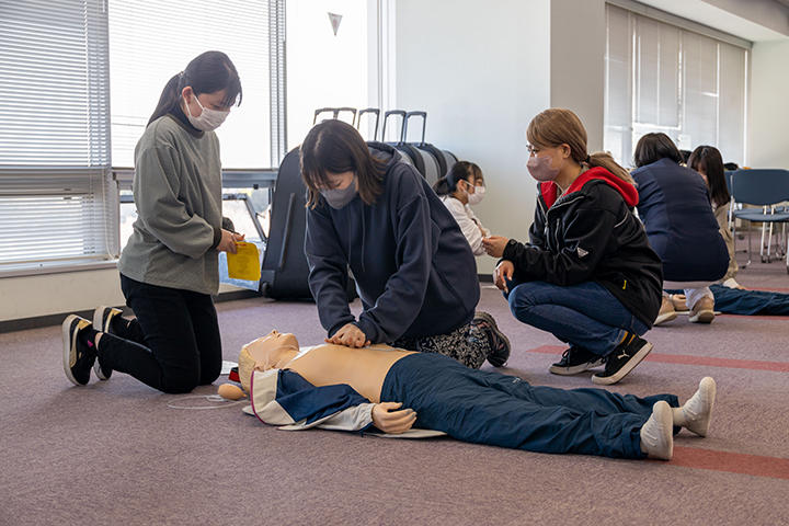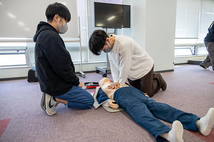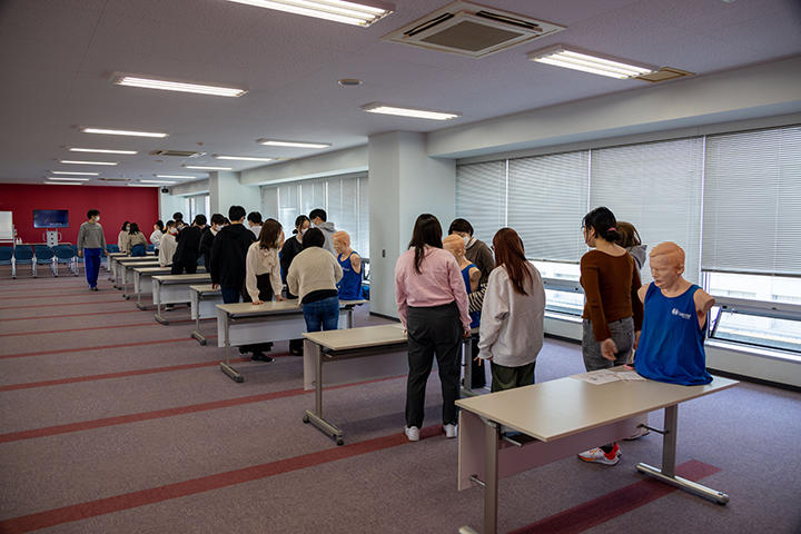 中央にあるのは、心肺蘇生・AED使用方法を学ぶための人形です。学生達は担当の先生から、操作手順について教わっています。心臓マッサージを実施する時は、手の使い方やマッサージする部位が重要になるためポイントとなる内容を理解することができました。