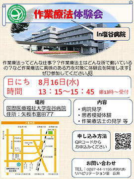 今回は大学付属の国際医療福祉大学塩谷病院で「作業療法体験会」を開催。実際に作業療法士が働いている病院で、作業療法士の仕事を間近で見ることができます。患者模擬体験イベントもあります。
