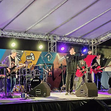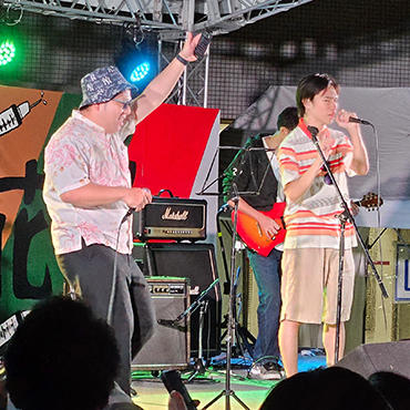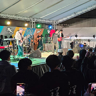 7日の夕刻には理学療法学科の学生と教員で編成したバンドもメインステージに登場。2・3年生の学生を中心にボーカルやギターを担当し、教員も谷先生はキーボードとアコースティックギター、糸数先生はベース・三線、屋嘉比先生はボーカルを担当しました。学生も一緒に演奏し、今年も学生と教員と会場が一体となる感動のステージでした。学生の良い思い出になったかと思います。