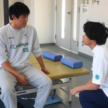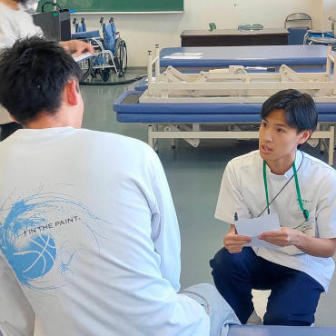 今回の授業では、教員が作成した脳卒中と大腿頸部骨折の患者さんの症例を使用して、病気の状態やリハビリテーションの進みに合わせて理学療法評価を考え、評価を実施する課題でした。実技試験までに1カ月近くチームで話し合い、練習を重ねてきました。