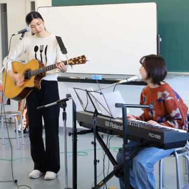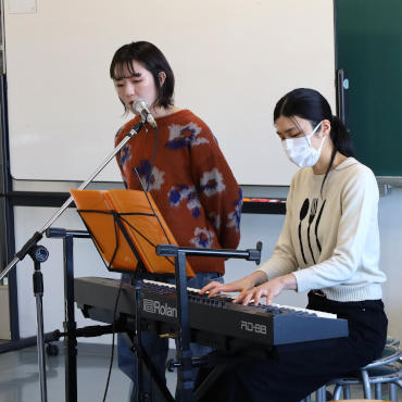このイベントでは、理学療法学科の教員や学生が有志でライブを行いました。今回はお昼休みということで時間がなく、2組で3曲を披露しました。学生は、『ズートピア』主題歌「トライ・エヴリシング」と「Amazing Grace」を演奏しました。教員は、屋嘉比先生がボーカル、谷先生がピアノ、糸数先生がベースでサザンオールスターズの「白い恋人達」を演奏しました。
