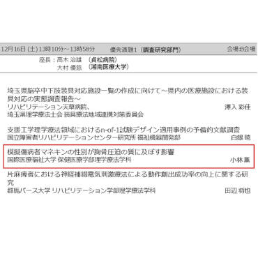 この度、第12回日本支援工学理学療法学会学術大会において小林先生と柊学科長が発表した演題が学術大会長賞を受賞しました。演題タイトルは「模擬傷病者マネキンの性別が胸骨圧迫の質に及ぼす影響」です。学会ホームページの「耳寄り情報」から演題動画が閲覧できますので、詳細を是非ご覧下さい。理学療法学科では研究成果を学生教育に活かし、質の高い人材の育成を目指しています。