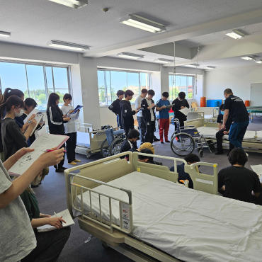 実際の患者様を想定した模擬患者を用いて、ベッドから車イスへの移乗動作を練習します。教員が模擬患者となり、移乗の際に注意すべきポイントや安全な介助方法を指導します。学生同士で練習を通して、患者様の状態に合わせた個別対応の重要性を学びます。
