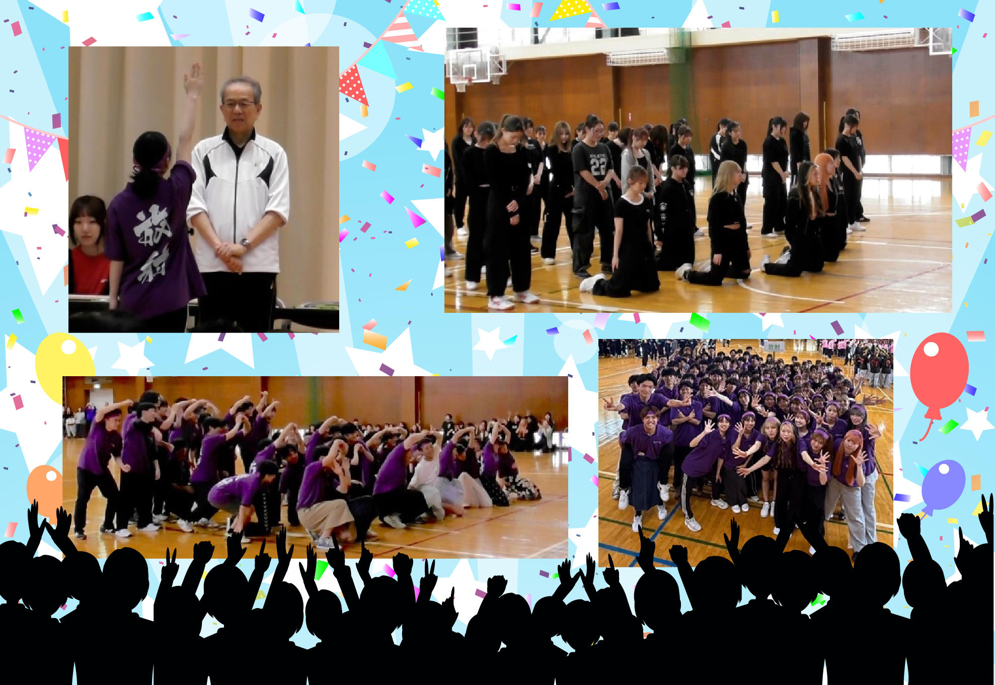 今年は、選手宣誓の写真にもあるように、背中に「放射」の文字をプリントし、学科カラーである紫色のポロシャツを作成しました。このポロシャツはどの学科よりもかっこよく、目立つことができたと思います。そして、特に、私たちは運動会に向けて応援合戦に力を入れて練習してきました(写真参照)。去年の先輩たちは応援合戦で準優勝という好成績を残していて、全員がプレッシャーを感じていました。しかしながら、男女ともに空きコマの時間を利用して全体練習を行い、男女のイメージを逆転させ、女子はかっこよく見せる曲や振付とし、男子は可愛らしく、工夫しました。本番では他の学科が盛り上がりを見せる中、緊張はしましたが、私たちらしく楽しく踊れたと思います。また、ムカデリレーでは、あまり練習時間が取れていないにも関わらず、本番では息を合わせ、中には、走るのではなく、ジャンプしながら進んでいくというユニークな発想でゴールを目指しました。惜しくも3位という結果ではありましたが、その場の全員を驚かすような面白い走りだったと思います。