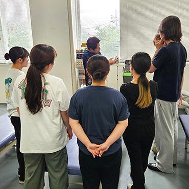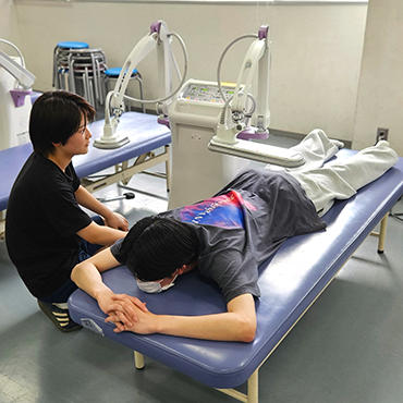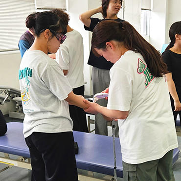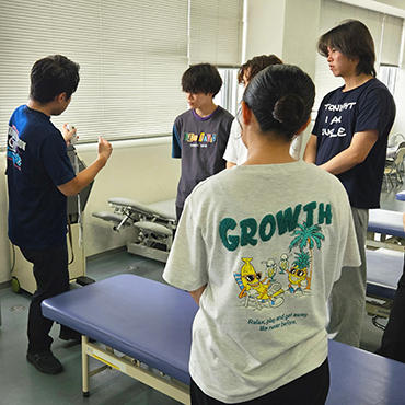 この講義では、物理療法学の基礎知識を修得するだけでなく、実際にさまざまな物理療法機器に触れ、その効果を体験する演習が行われます。学生たちは初めて使う機器に興味津々の様子で、積極的に実習に取り組んでいました。