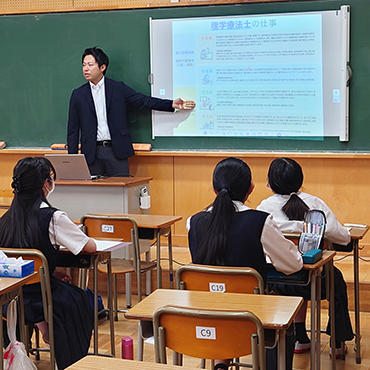 講義では、原先生が理学療法士の仕事や大学での学びについて、また渡邉先生は作業療法士の仕事の広がりについて解説。アスリートのリハビリ事例や小児分野での活動にも触れられ、生徒たちは興味津々の様子でした。講義後のパネルディスカッションでは、「仕事で大切にしていること」など、生徒からの質問に先生方が丁寧に回答。患者さんとの信頼関係やチーム医療におけるコミュニケーションの重要性が繰り返し強調され、生徒たちは医療現場で不可欠な「人との対話」の大切さを実感しました。