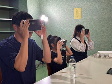 オープンキャンパスでは様々な企画を通して、言語聴覚士のお仕事の一端に触れていただきます。また、展示ブースでは、言語聴覚士とは何か、言語聴覚士の魅力をたくさん知ることができます。今回初導入のVR体験は、言語聴覚士の視点でコミュニケーション障害のリハビリ場面を体感できるもので、ご好評いただきました。