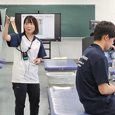 セミナーは3部構成で行われ、参加者はスポーツと理学療法の奥深さに触れる貴重な機会を得ました。本学科の松本先生が講師を務め、スポーツ科学の基礎から応用までを分かりやすく解説しました。理学療法士によるストレッチとテーピングの実習では、参加者が実際に体を動かしながら技術を習得しました。足のつり予防に効果的なふくらはぎのテーピング技術や、選手への効果的なストレッチ方法など、すぐに役立つプロの技に、高校生も保護者も真剣な表情で取り組んでいました。