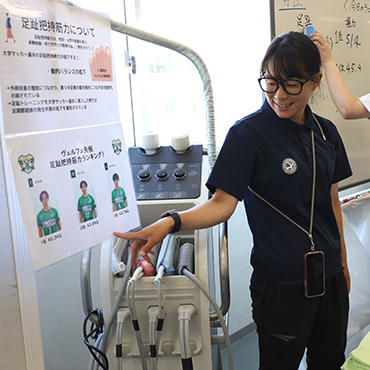 当日は、理学療法士が実際に使用する専門的な機器を使った多彩なプログラムが用意されました。参加者はまず、「フィジカルチェック」で握力やバランスといった自身の身体能力を測定。理学療法士がどのように身体の状態を科学的に評価するのか、その一端を体験しました。また、アスリートの治療などにも使われる「電気療法」を実際に体験し、その体験に驚きの声が上がりました。