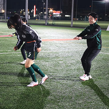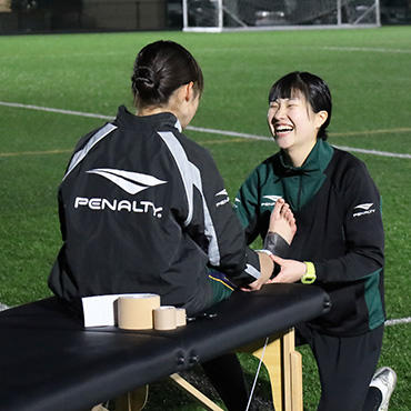 学生たちは、選手一人ひとりの身体の状態を評価し、適切なテーピングを施すほか、リハビリテーションと連携した効果的なトレーニングメニューを指導しています。この一連の作業を通じて、知識を現場で応用する実践力と、選手との信頼関係を築くコミュニケーション能力を磨いています。